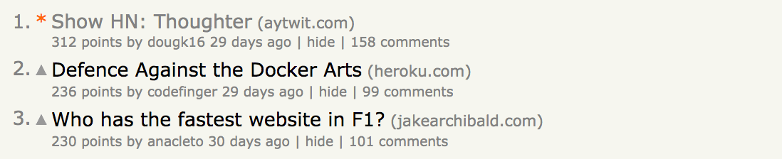 Thoughter to Hacker News. HN is a very popular tech news site and one of its features is that you can submit personal projects for random internet people to frown down on. As you can see from